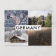 Postcard with a collage of 4 photos of places in Germany, like Freudenberg half-timbered houses, Bastei Bridge, Butg Eltz castle and a typical alpine chalet in Bavaria.