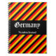 This notebook design features a pattern of black, red and yellow stripes, inspired by the colors of the German national flag. It also features personalized text. It could be used to record memories of a vacation to Germany.