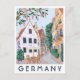 Experience the cozy charm of a classic German village with this illustrated travel postcard featuring timber-framed houses, cobblestone streets, and a peaceful café corner beneath flowering branches. Created in a vintage travel poster style with soft colors and storybook details, the artwork captures the warmth and romance of strolling through historic European towns.