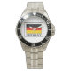 Has heft and feel of expensive stainless steel quartz watches. Good band with safety catch. I removed links, which is easy because engraved arrows show direction to push the linking pins. As always by this seller, the image (a railroad logo) is a perfect reproduction of my emailed image, and is precisely spaced and aligned.
