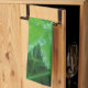 Grosse, glänzende Wassertropfen hängen an einem hübschen, hellgrünen Frauenmantelblatt vor grünem Wiesenhintergrund auf diesem American MoJo Geschirrtuch.