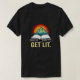 My 11 yo wore adult XL (5’7” 165#). The 8yo is small framed. She wore adult small and tied it in the back. Grandma wore adult large with long sleeve shirt underneath. Tall girl adult medium. Dark haired male adult large. Good quality dark Heather gray, Gildan brand shirt. -it was next up from basic choice and cost about $20 per shirt. Not too thick or thin. Washed and dried well, no major shrinkage. Not see-through. Can wear a bra under it fine. Screen print is just as shown and well done, front and back.