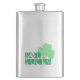 Modern design with typographic letters: "Get Lucky" (green and transparency digital effect) + a big half-transparent clover with small shamrocks inside and white background. Perfect flask for St Patrick. Matching products.