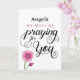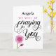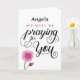 Encourage someone recovering from an illness or injury by letting them know you are praying for them by name with this custom front calligraphy typography design featuring the message, "CUSTOM NAME HERE we will be praying for you." Design is accented by beautiful pink watercolor flower in lower left corner of card. Inside can be customized with your own message.