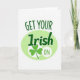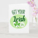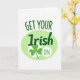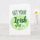 This card features a white background with layered greens that feel like a friendly wink between close friends on St. Patrick’s Day 💚. Centered on the front, the phrase “GET YOUR Irish ON” is set in a rounded sans‑serif style, with “GET YOUR” and “ON” smaller and “Irish” much larger. “Irish” appears in dark emerald green and sits inside a soft pastel green oval that frames it like a gentle spotlight. Beneath the words, a three‑leaf shamrock in the same deep green adds a simple, lucky touch ☘️. The layout is neatly centered, giving the design an easy, confident balance that suggests an open invitation to join in together. Two small white circles outline the letters in “ON,” adding a light, rhythmic detail near the bottom of the text. The pastel oval glows softly against the white space, with the shamrock anchored directly below the lettering.