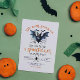 Get your spook on; spooktacular Halloween party invitation featuring a black and blue bat graphic with retro Halloween party typography on a white background.