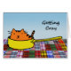 Getting Cozy, Orange Cat in Yellow Pan. Blank inside. Any occasion greeting card with a cute illustration of a orange cat in a yellow pan. Bright and colorful madras plaid fabric under the pan and cat. Art, image, and verse copyright © Shoaff Ballanger Studios.
