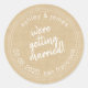 Chic and simple save the date label, with your names and wedding date in white modern typography on a kraft paper background, and the text 'we're getting married' in stylish script font. Use these wedding stickers for your wedding gifts, gift bags or as a save the date envelope seal. Exclusively designed for you by Happy Dolphin Studio. If you need any help or matching products, please contact us at happydolphinstudio@outlook.com.