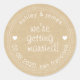 Chic and simple save the date label, with your names and wedding date in white modern typography on a kraft paper background, and the text 'we're getting married' in stylish script font. Use these wedding stickers for your wedding gifts, gift bags or as a save the date envelope seal. Exclusively designed for you by Happy Dolphin Studio. If you need any help or matching products, please contact us at happydolphinstudio@outlook.com.