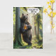 A bear stands leisurely against a tree holding a mug of beer with one paw in a sunlit summer forest with a humorous speech bubble for 50th birthday.