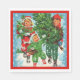 Christmas party napkins with happy, cheerful children getting the Christmas tree back to home after cutting it in the forest.