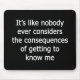 For the sarcasm lover in all of us. Check out this witty “It’s Like Nobody Ever Considers the Consequences of Getting To Know Me” design on apparel and gifts.