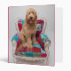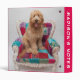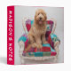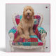 A happy Goldendoodle sitting contently on a colorful, patterned chair. This cute shaggy puppy seems to be larger than the chair but never too big to hold in your arms. With his tongue sticking out, facing the camera in this photo, he would make the perfect companion. Discover lots more cute puppies here on Zazzle with Getty Images.