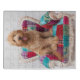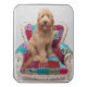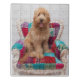 A happy Goldendoodle sitting contently on a colorful, patterned chair. This cute shaggy puppy seems to be larger than the chair but never too big to hold in your arms. With his tongue sticking out, facing the camera in this photo, he would make the perfect companion. Discover lots more cute puppies here on Zazzle with Getty Images.
