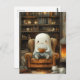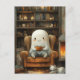 An adorable ghost and cat sitting in a library as the ghost enjoys some nice warm coffee