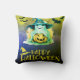 The color palette of the pillow exudes the vibrant spirit of Halloween, with lively greens and blues coming together to create a sense of excitement and delight. This design captures the perfect balance between cuteness and festivity, celebrating Halloween as a time for spirited celebration.
