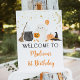 Welcome your party guests with an adorable personalized sign. This cute design features my hand painted watercolor Halloween illustrations.