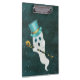 This clipboard has a white ghost with big blue eyes floating in a night sky with stars. He is wearing a blue top hat with a gold ribbon holding a fancy cane topped with a golden skull on the front and back.