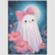A cheerful ghost with a pink bow floats among vibrant pink flowers and lush green foliage beneath a glowing full moon.