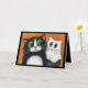 Halloween greeting card featuring an illustration of 2 cats. One is a tuxedo cat and the other is hidden under a sheet pretending to be a ghost. Inside reads, "Happy Halloween". Artwork © Lisa Marie Robinson. All Rights Reserved.