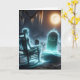 A ghostly male figure sits in a rocking chair, facing a gravestone marked "R.I.P." under a full moon