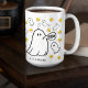 This cute coffee mug features whimsical ghosts and candy corn with your custom name or other text. Click "Personalize this Template" to easily change or remove the featured sample name. Enjoy your coffee or cocoa this Halloween season with this fun, spooky mug!