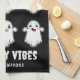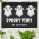 Destei's illustrations of cute ghost characters with different kind of face expression. There is also text that reads: "Spooky vibes" together with a personalizable text area for a family name or other custom text. The background color is black, but it can be changed to any other color, if so wished.
