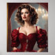 This image features a stunning portrait of a woman exuding old-world glamour, perfect for a Pinterest board themed around historical fashion and beauty. She wears a rich, red gown detailed with intricate embroidery and puff sleeves that slip off the shoulder, highlighting a romantic and regal aesthetic. Her hair is styled in voluminous waves that frame her face elegantly, paired with classic makeup featuring a bold red lip and captivating smoky eyes. Jeweled earrings add a touch of sparkle that complements the luxurious theme. The setting includes a glimpse of an opulent room with a grand chandelier, reflecting off a gilded mirror that enhances the sumptuous ambiance.