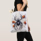 On this unique tote bag, a giant black widow spider has caught orange pumpkins in her web. Appropriate for the Halloween season, but could be used all year long. The same image is printed on both sides of the bag.