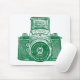 A Mouse pad with a high contrast, high passed filtered and vectorized image of a vintage East German camera from the 1950s. Creating a strong bold toothy retro screen print. or medieval Gothic brass rubbing like effect.