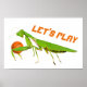 This unique sports poster features a giant green praying mantis and the words "let's play".