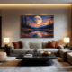 A giant moon dominates the night sky, illuminating snow-capped mountains and reflecting on a calm lake. Tall trees frame the shores, while orange and blue clouds paint the horizon. Stars twinkle around, creating a magical scene that conveys peace and wonder. Perfect for evoking dreams and connections with wild nature, this artwork blends celestial beauty and earthly tranquility in a single moment.