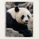 This image shows a giant panda perched on a rock formation. As few as 1,864 giant pandas live in their native habitat. The largest threat to giant panda survival is habitat destruction. People in need of food and income have cleared forests for agriculture and timber. This logging has fragmented a once continuous habitat, leaving small groups of pandas isolated from each other. | "Smithsonian" and the Smithsonian logo are registered trademarks owned by Smithsonian Institution.