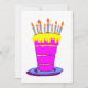 A giant birthday cake with pink and yellow frosting dripping icing and blue glowing candles.