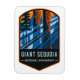 A vintage travel badge design of the Giant Sequoia National Monument located in the southern Sierra Nevada in eastern central California