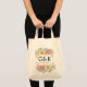 Elegant floral bouquet with light pink and yellow roses, white background, and customizable text template wedding tote bag design.