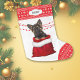 The front of this Holiday stocking shows an image of an adorable German Shepherd puppy peeking out of a red and white Santa style gift bag. Behind the dog is a red beaded garland. The toe and top border are a red and white snowflake pattern. On the top border is a white label with your custom text in dark gray. The back of the stocking is the same red and white snowflake pattern.