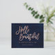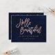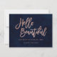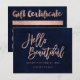 A modern, stylish gift certificate hello beautiful typography with modern hand lettering style brush typography in faux rose gold foil on a trendy and elegant navy blue watercolor background. If you need any customization, don't hesitate in contacting me