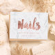 A modern, stylish gift certificate Nails artist business card with modern hand lettering style brush typography in faux rose gold foil on a trendy and elegant white marble background.
