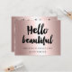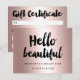 A modern, stylish gift certificate hello beautiful with modern hand lettering style brush typography in faux rose gold foil on a trendy and elegant rose gold foil metallic background.