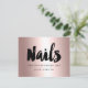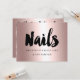 A modern, stylish gift certificate beauty nail technician business card with modern hand lettering style brush typography in faux rose gold foil on a trendy and elegant rose gold foil metallic background.