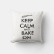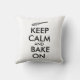 This custom pillow has a kitchen whisk and says Keep Calm and Bake On.