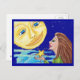 This fantasy lady dressed in green is presenting the full face yellow moon with a gift of a star. He seems to be happy because he is smiling and his blue eyes are shining. The card has a blue border. Image is my original artwork done in acrylics. See my store Art by MAR for matching products with this design.
