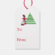 Elf (doll in crochet), with sack of presents, in front of graphic Christmas tree created with horizontal lines. Text "To:" and "From:" spaced below for giver to fill in. Second side shows the "Merry Christmas" in same red font as other side.