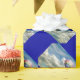 Hot air balloon in rainbow colors, floating among white, fluffy clouds. Image is angles and looks like a postcard affixed to the paper with angle corners (i.e. corners are cut off). Dark blue background is basis of wrapping paper color.