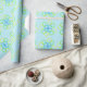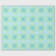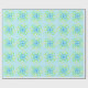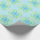 Intersecting rings in sets are three (blue, green, yellow), are replicated four times and the blue rings interlocked in the middle. Resulting motif is replicated across the paper with a pale blue background.