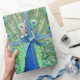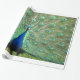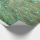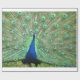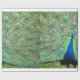 Brilliant blue peacock has his tail feathers spread across the entire surface of the paper.