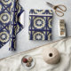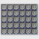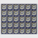 Quilted yellow, white and dark blue "Star flower" pattern. The central "star" is a white with dark yellow ducks. This is surrounded by "petals" of dark blue with red, blue and yellow flowers. A second petal row is yellow and white gingham check, followed by the blue pattern again, with the corners in the yellow gingham. Current background is dark blue, but may be customized to pick out the other colors.