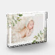 Personalized photo block keepsake with your newborn baby photo, name and birth stats or other custom text. Elegant feminine design has a painted watercolor floral border with white flowers and green and gold foliage. Use the design tools to edit the text fonts and colors or add more photos to create a one of a kind keepsake or gift.