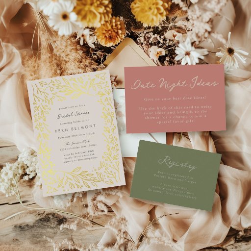 Bohemian and romantic bridal shower thank you gold foil greeting cards. The Gilded Garden suite features beautiful botanicals framing elegant typography is soft color combos. Perfect for an elegant garden bridal shower.
